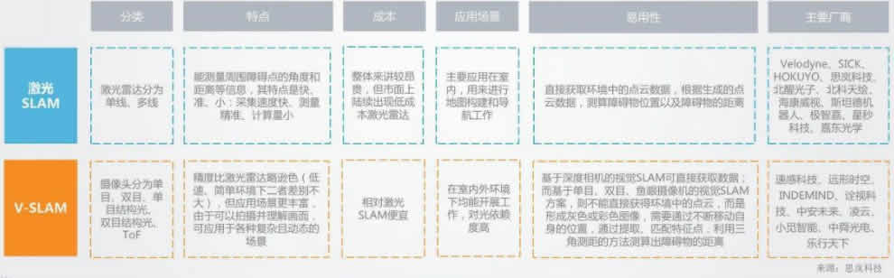 SLAM系統通常包含多種傳感器和多種功能模塊。按照核心的功能模塊區分,目前常見的機器人SLAM系統可分為兩種形式:基于激 光雷達的SLAM(激光SLAM)和基于視覺的SLAM(V-SLAM)。激光SLAM目前發展比較成熟、應用廣泛,未來多傳感器融合的SLAM 技術將逐漸成為技術趨勢,取長補短,更好地實現定位導航。