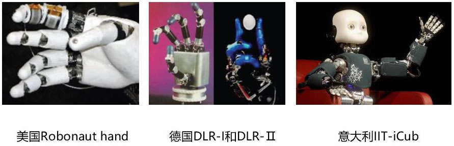 2) 德國(guó)宇航中心先后研制成功了 DLR-Ⅰ和 DLR-Ⅱ靈巧手,共集成了 25 個(gè)傳感器, 包括類(lèi)似人工皮膚的觸覺(jué)傳感器、關(guān)節(jié)扭矩傳感器、位置傳感器和溫度傳感器 等,靈巧手在靈活性和感知能力方面有顯著提升。